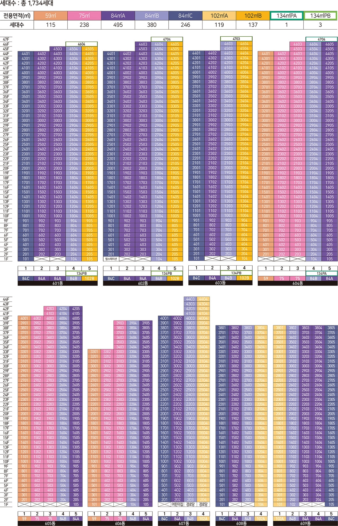 | 세대수 | 지하 2층 ~ 지상 47층 9개동 1,734세대 |
