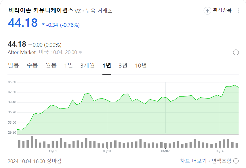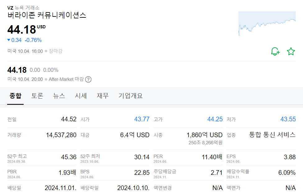 - 주요 내용: Verizon은 미국 통신업계를 대표하는 기업 중 하나로, 안정적인 현금 흐름과 고배당으로 유명합니다. 2024년 현재 배당수익률은 6.1%로, 안정적인 배당 지급을 유지하고 있으며, 통신 인프라와 5G 확장 투자로 장기적인 성장을 도모하고 있습니다.