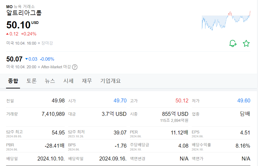 - 주요 내용: Altria는 미국 담배 시장에서 가장 큰 회사 중 하나로, 매우 높은 배당수익률을 제공합니다. 비록 담배 산업이 규제와 소비 감소 등의 도전에 직면해 있지만, Altria는 여전히 강력한 현금 흐름을 유지하고 있으며, 주주들에게 꾸준히 높은 배당금을 지급해 왔습니다. 특히 배당 성장 역사도 10년 이상 이어져 왔습니다.