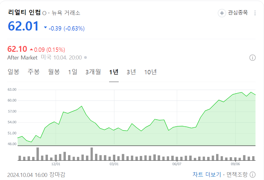 - 주요 내용: Realty Income은 미국 상업용 부동산 투자신탁(REIT)으로, "월 배당 회사"로도 알려져 있습니다. 이 회사는 매달 배당금을 지급하는 특성으로 유명하며, 꾸준한 현금 흐름을 통해 안정적인 배당 지급을 보장합니다. 부동산 시장이 경기 변동에 민감하지만, Realty Income은 장기 임대 계약을 통해 안정적인 수익을 창출하고 있습니다.