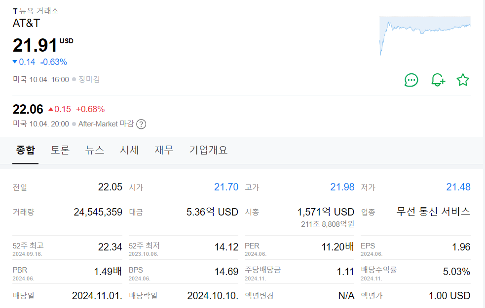 - 주요 내용: AT&T는 미국 최대 통신사 중 하나로, 통신 서비스와 미디어 부문에서 안정적인 수익을 창출하고 있습니다. 특히 5G 서비스와 WarnerMedia 인수를 통해 장기적인 성장 가능성을 높이고 있으며, 배당금도 꾸준히 지급되고 있습니다. 2024년 현재 배당수익률은 약 7.6%로, 고배당주를 찾는 투자자들에게 이상적인 선택입니다. AT&T는 배당을 지급한 지 30년이 넘었으며, 이는 이 회사의 배당 지급 안정성을 입증하는 중요한 지표입니다.